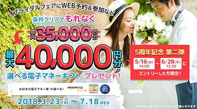 マイナビウエディングの「春夏のカップル応援キャンペーン」とは、ブライダルフェアの予約&参加の条件をクリアするだけで、最大35,000円分の商品券がもらえるというものです。