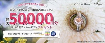 マイナビウエディングを経由してジュエリーショップに来店予約し、結婚指輪(婚約指輪)を購入すると最大50,000円分の商品券がもらえるキャンペーンです。